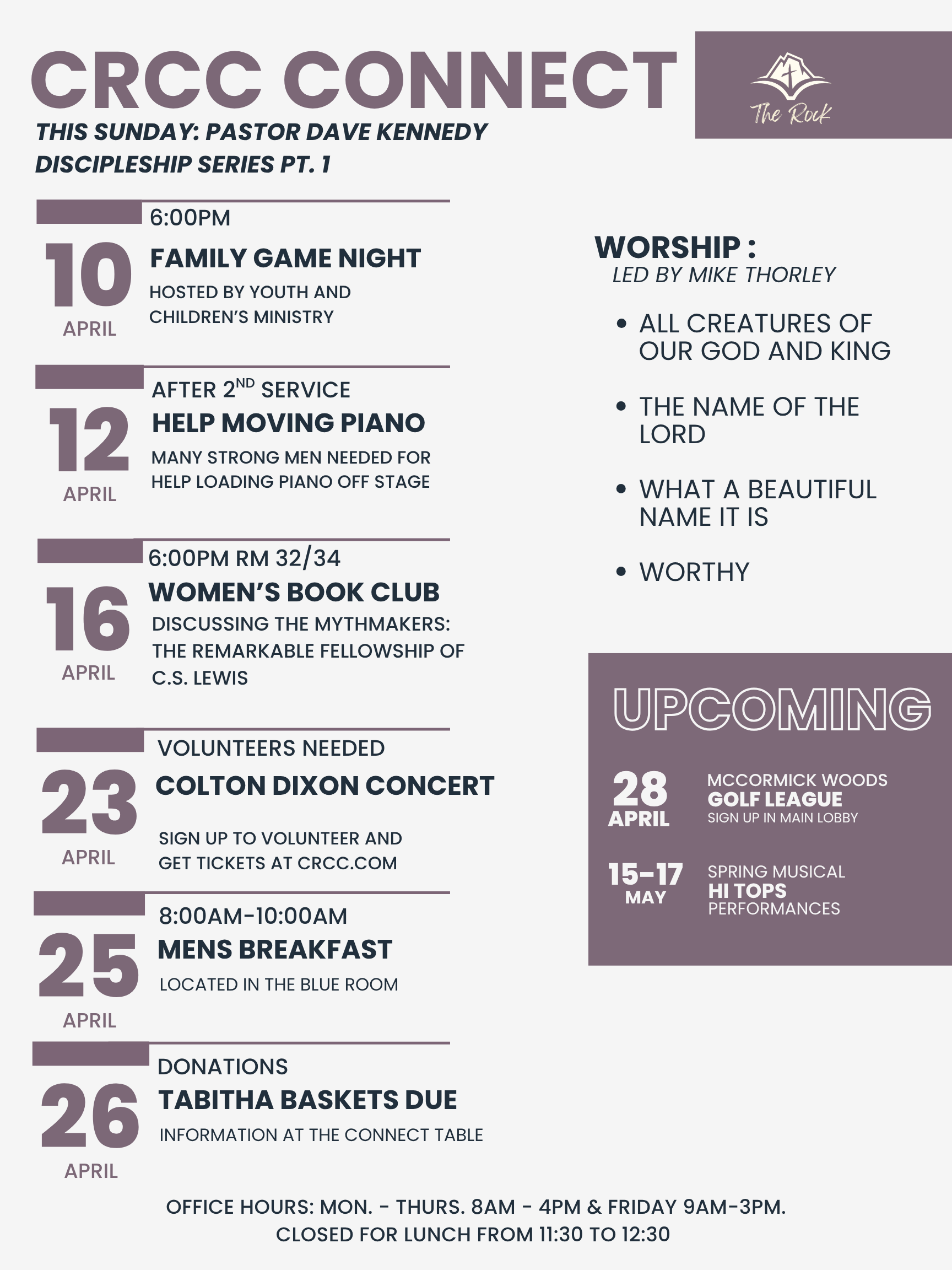 The Connect is a weekly communication to let you know what is happening here at the Rock!